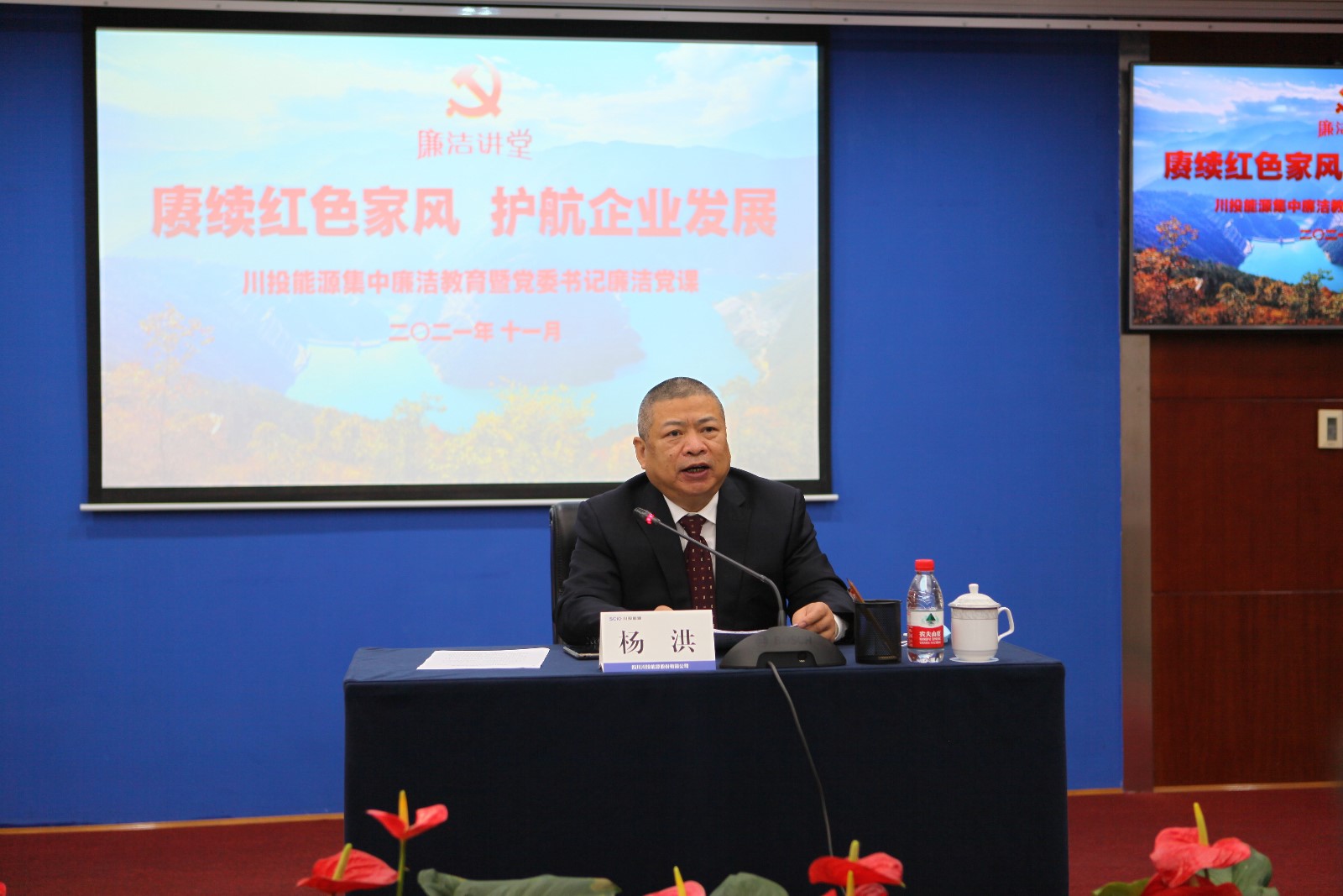 為貫徹落實中央關於全麵從嚴治黨部署和要求,切實推進公司黨風廉政建設,推動“好風傳家”工作落實落細,2021年11月25日上午, 川投能源黨委組織召開了2021年集中廉潔教育會,公司黨委書記、副董事長、總經理楊洪以“賡續紅色家風,護航企業發展”為題給公司黨員幹部講授廉潔黨課,並組織觀看了由中央紀委國家監委宣傳部、中央廣播電視總台聯合製作的電視專題片《正風反腐就在身邊》之《嚴正家風》。公司黨委副書記、工會主席冉蘭平主持會議。