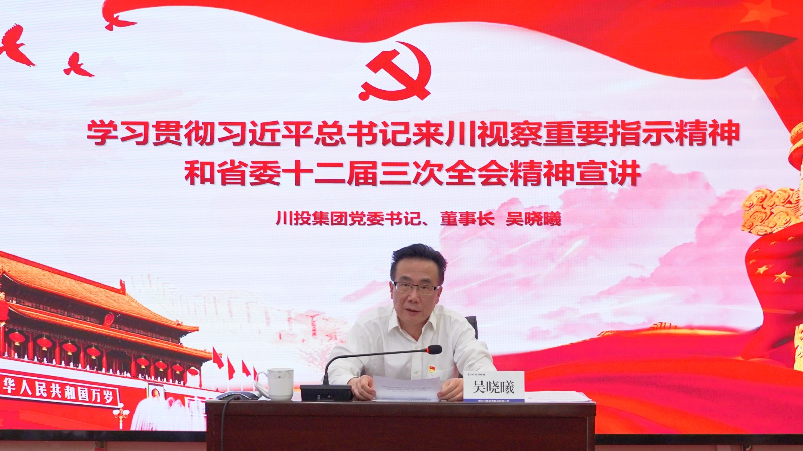 吳wu曉xiao曦xi立li足zu當dang前qian國guo情qing省sheng情qing,結jie合he川chuan投tou能neng源yuan改gai革ge發fa展zhan現xian狀zhuang,圍wei繞rao習xi近jin平ping總zong書shu記ji來lai川chuan視shi察cha重zhong要yao指zhi示shi精jing神shen和he省sheng委wei十shi二er屆jie三san次ci全quan會hui精jing神shen進jin行xing了le深shen入ru闡chan釋shi和he係xi統tong解jie讀du。他ta指zhi出chu,習xi近jin平ping總zong書shu記ji來lai川chuan視shi察cha重zhong要yao指zhi示shi精jing神shen是shi對dui四si川chuan工gong作zuo最zui權quan威wei、最深刻、最有力的科學指導。要深刻領會習近平總書記對四川的深切關懷,凝心鑄魂強化忠誠;要自覺擔當習近平總書記賦予的戰略使命,增強機遇意識和進取精神;要全麵落實習近平總書記部署的重點任務,全力以赴拚經濟、搞建設、抓發展;要認真落實習近平總書記對主題教育的最新部署,以主題教育為牽引全麵加強黨的建設。