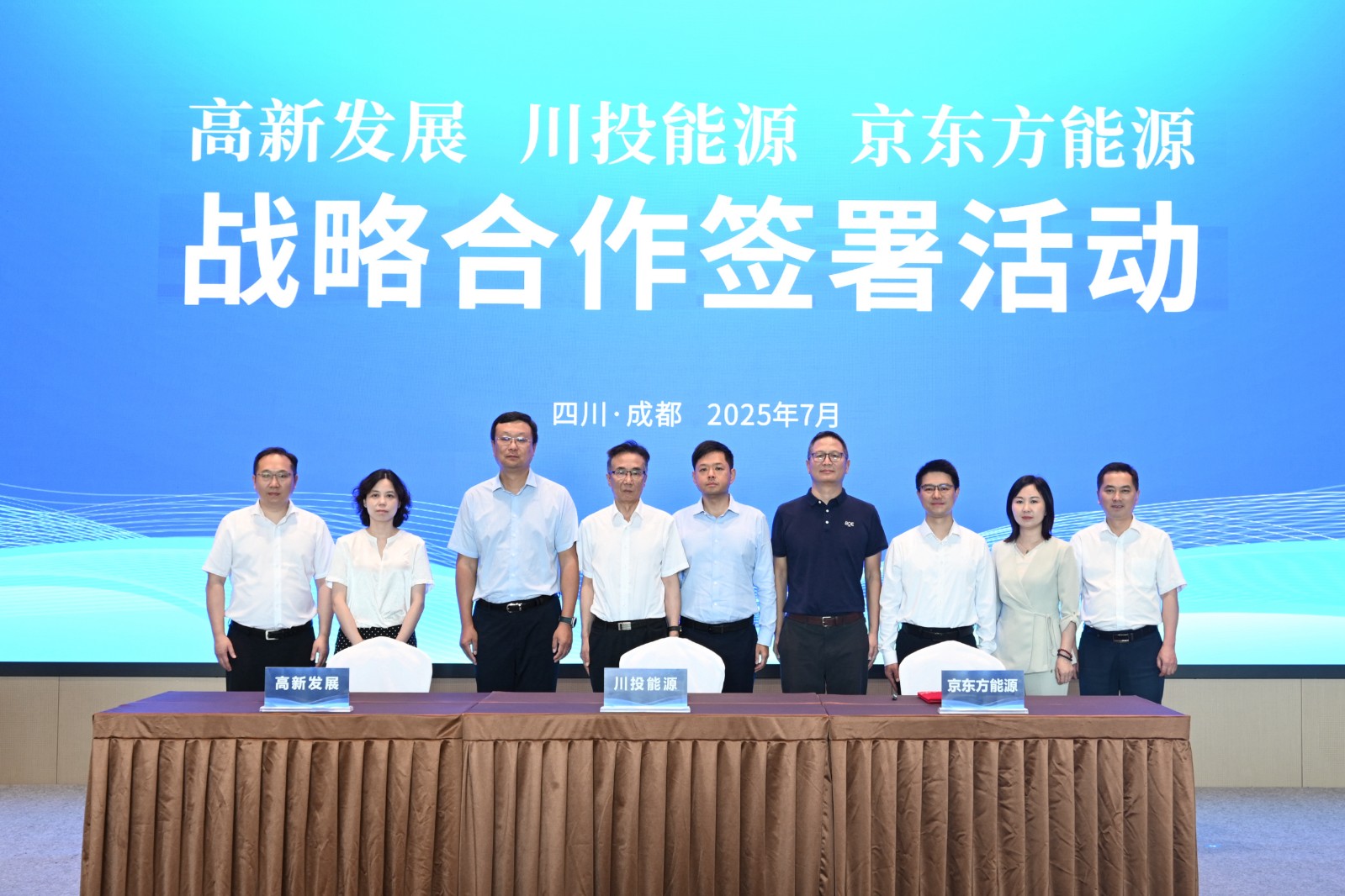 7月25日,四川川投能源股份有限公司、成都高新發展股份有限公司與京東方能源科技股份有限公司在成都高新西區IC設計產業園簽署戰略合作協議,在全國範圍共同推進新型儲能示範項目、能源互聯網構建及新能源產業投資。成都高新區黨工委委員,管委會副主任車軸;四川能源發展集團黨委副書記、副董事長、總經理,川投能源董事長吳曉曦;京東方科技集團副總裁,京東方能源科技黨支部書記、董事長馬亮;成都高投集團黨委副書記、總經理,電子集團董事長,高新發展董事長周誌等有關領導出席活動並見證簽約。