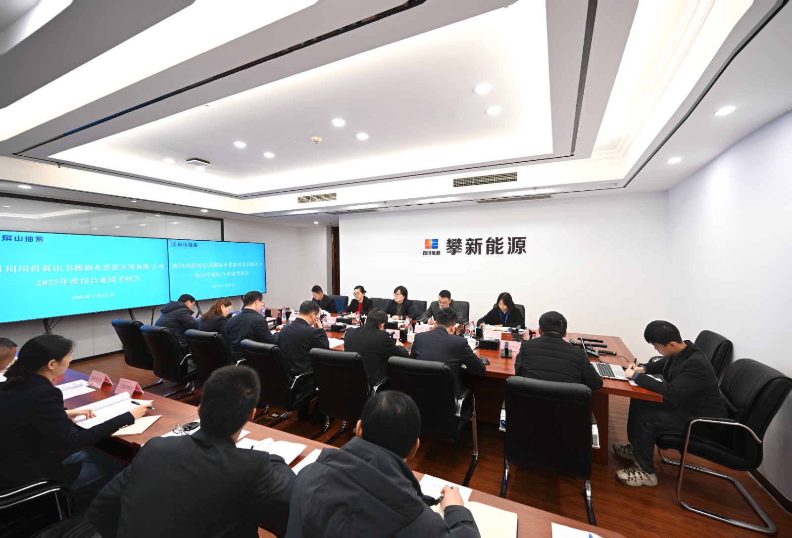 1月23日,川投能源董事會秘書、總法律顧問魯晉川帶隊赴屏山抽蓄公司開展2025年度綜合業績考核。川投能源副總經理、屏山抽蓄公司董事長王行仁出席考核會。川投能源綜合業績考核組,屏山抽蓄公司經營班子成員、中層幹部、職工代表參加會議。