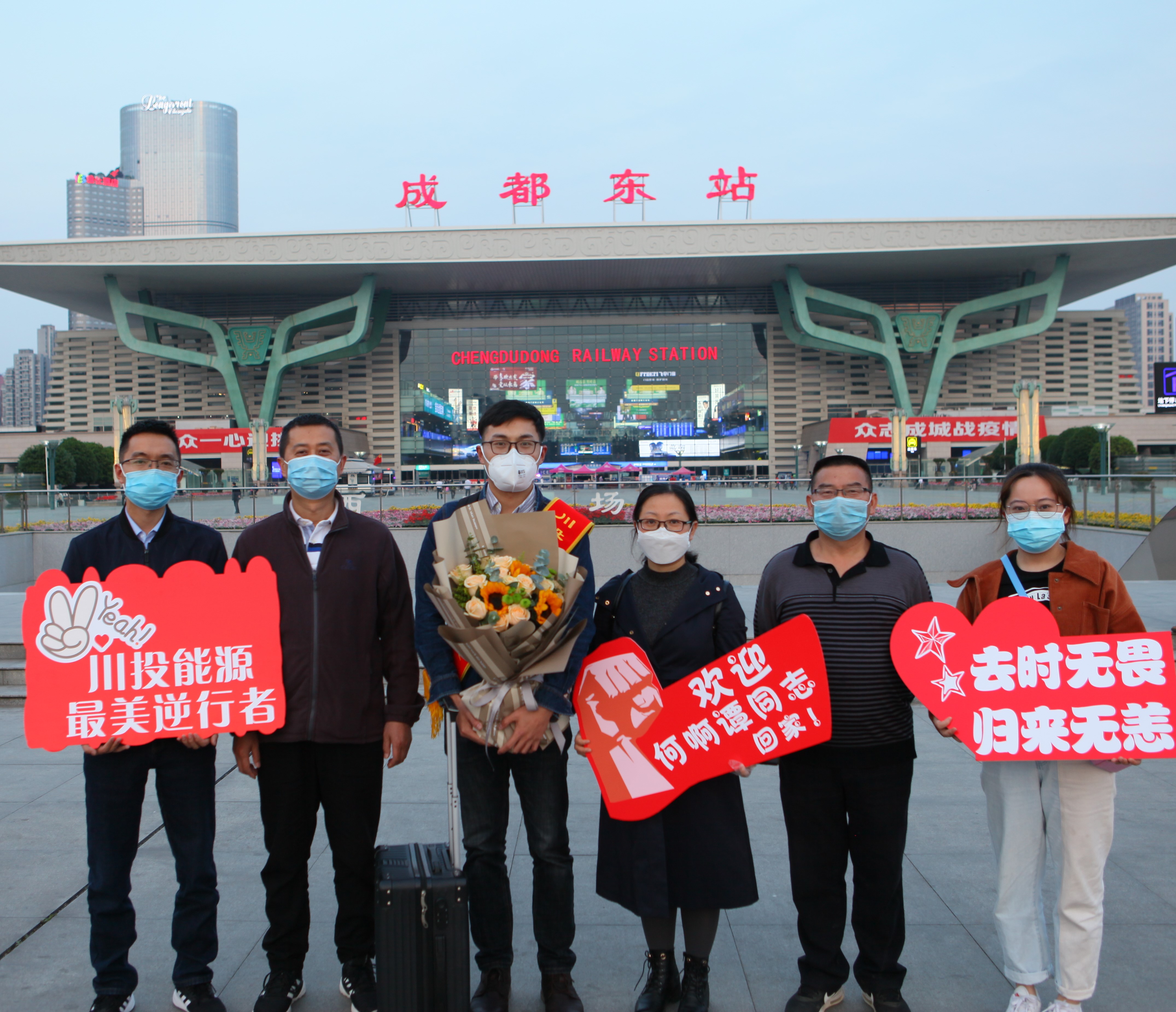4月25日,川投能源 “最美逆行者”、交大光芒工程突擊隊隊員何啊潭同誌圓滿完成在武漢鐵路局的值守任務,帶著勝利和平安凱旋歸來。川投能源黨委副書記、工會主席楊超龍與黨群工作部主任楊鑫以及交大光芒黨總支委員汪誌橋一道,手捧鮮花,到成都東站迎接川投能源“最美逆行者”回家。