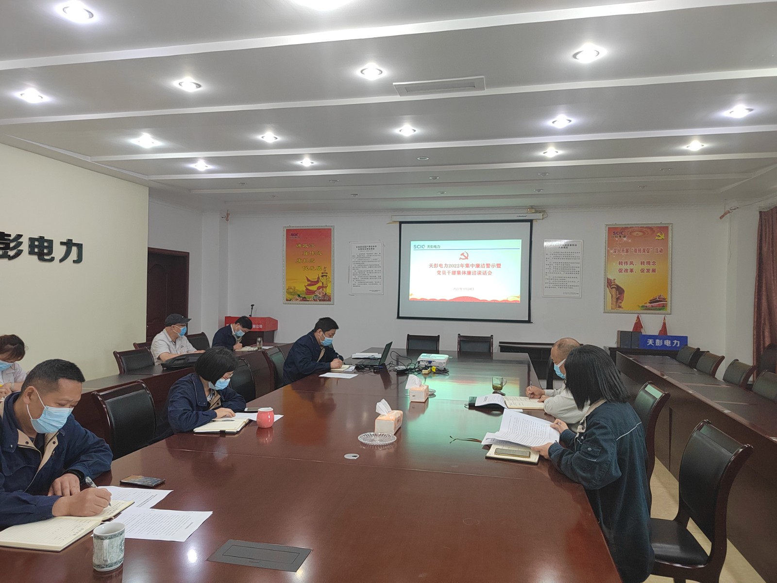 為進一步加強公司黨風廉政建設工作,落實全麵從嚴治黨要求,築牢領導幹部廉潔自律防線,天彭電力在公司二樓會議室召開2022年集中廉潔警示教育暨黨員幹部集體廉潔談話會。公司領導班子成員、各部門(車間)負責人,關鍵崗位人員參加會議,會議由黨總支委員、紀檢小組長、工會負責人汪曉力主持。