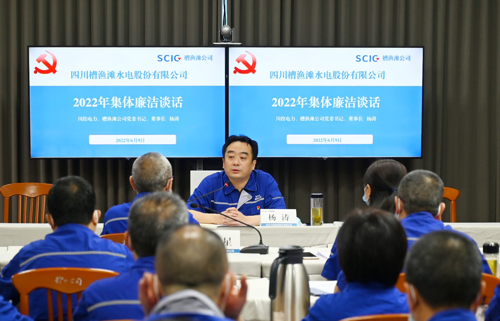 為深入貫徹全麵從嚴治黨要求,加強黨風廉政建設工作,督促“關鍵少數”知責、履責、盡責,持續築牢“不想腐”的思想道德防線。6月9日,槽漁灘公司召開2022年度黨員幹部集體廉潔談話暨警示教育會,會議由黨委委員、紀委書記謝愛東主持,公司領導班子、中層管理幹部及關鍵崗位人員參加會議。