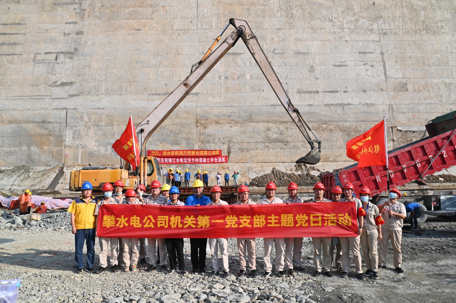 按照銀江水電站“決戰四季度、大幹一百天”活動安排,計劃於9月29日下午開始主體工程泄水係統消力池首倉混凝土澆築。為服務該項重要節點目標的順利實現,9月29日,由機關第一黨支部牽頭,邀請聯建支部部分黨員,到銀江水電站施工現場,開展了主題為“服務消力池首倉混凝土澆築,在決戰100天活動中貢獻支部力量,以實際行動喜迎二十大”的主題黨日活動。