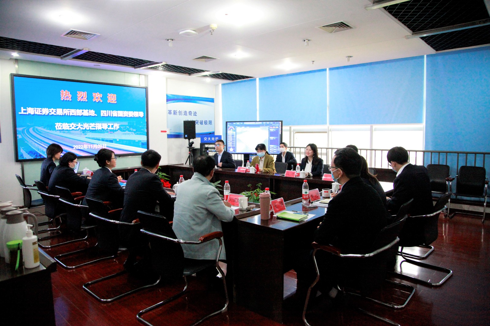 11月9日ri,上shang海hai證zheng券quan交jiao易yi所suo西xi部bu基ji地di市shi場chang發fa展zhan部bu資zi深shen專zhuan家jia馮feng晴qing,四si川chuan省sheng國guo資zi委wei企qi業ye改gai革ge處chu副fu處chu長chang梅mei潔jie一yi行xing蒞li臨lin交jiao大da光guang芒mang調tiao研yan指zhi導dao工gong作zuo。川chuan投tou集ji團tuan總zong經jing理li助zhu理li、資本運營部部長龔圓,資本運營部專員張弋奎,川投能源董事會秘書魯晉川陪同調研。會議由交大光芒董事長梁濤主持。
