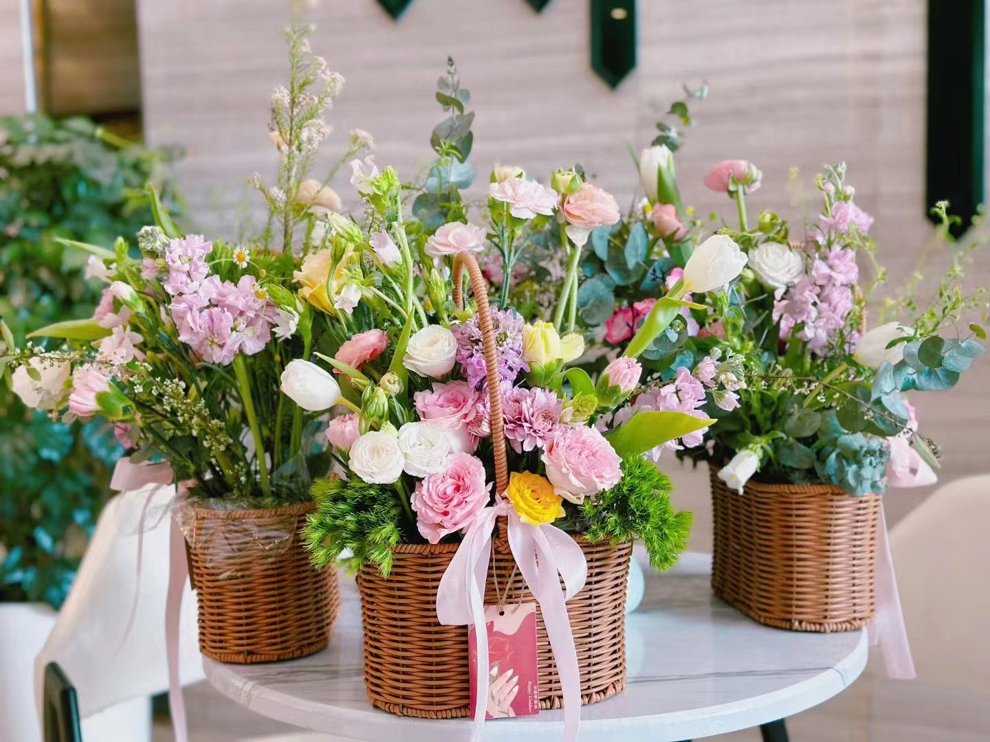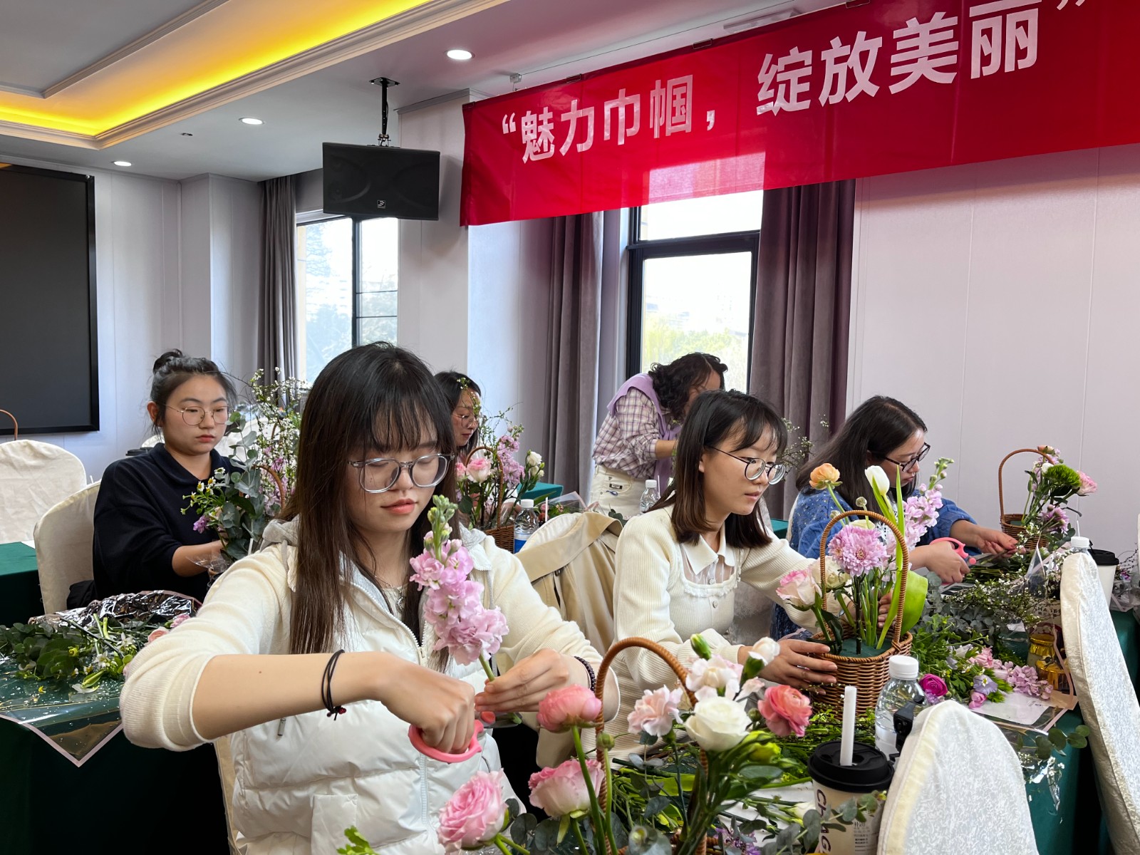 緊接著組織了DIY插花活動,邀請專業花藝師現場講解鮮花常識、色彩搭配、保鮮方法、花枝修剪和插花的基本技巧。在花藝師指導下,大家躍躍欲試,邊學邊交流,紛紛行動起來,開啟鮮花“綻放”之旅,現場春意盎然、熱(re)鬧(nao)非(fei)凡(fan),一(yi)雙(shuang)雙(shuang)巧(qiao)手(shou)將(jiang)各(ge)色(se)花(hua)卉(hui)配(pei)以(yi)枝(zhi)葉(ye)點(dian)綴(zhui),讓(rang)一(yi)把(ba)把(ba)散(san)落(luo)的(de)花(hua)材(cai)變(bian)成(cheng)了(le)美(mei)麗(li)靈(ling)動(dong)又(you)具(ju)有(you)個(ge)性(xing)特(te)色(se)的(de)花(hua)藝(yi)作(zuo)品(pin),大(da)家(jia)喜(xi)笑(xiao)顏(yan)開(kai),擁(yong)抱(bao)著(zhe)自(zi)己(ji)精(jing)心(xin)製(zhi)作(zuo)的(de)花(hua)籃(lan)合(he)影(ying)留(liu)念(nian)。