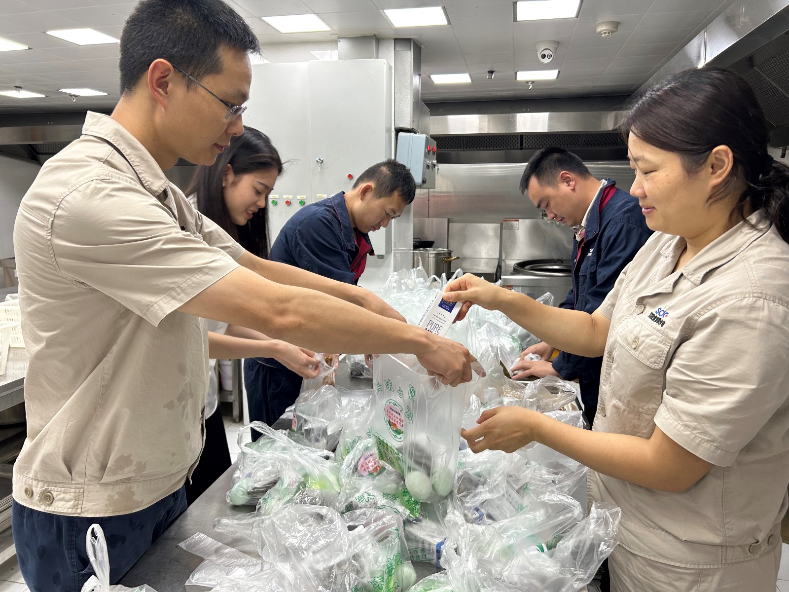 支部黨員、誌願者們放棄了難得的節日假期,下午就在職工食堂忙碌了起來,鹵雞腿,蒸粽子,煮鹽蛋,采用流水線工作方式,把熱乎乎的雞腿、粽子、鹽蛋、牛奶等提前進行分裝,方便工友們在工地食用。