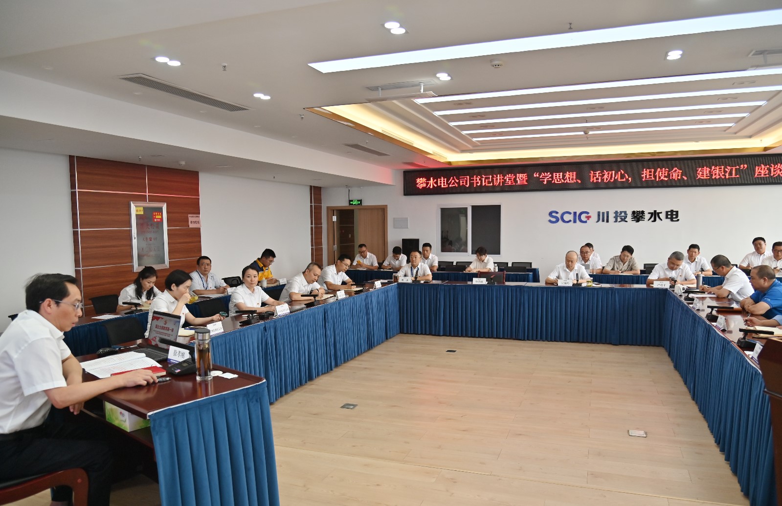 為紮實推進學習貫徹習近平新時代中國特色社會主義思想主題教育走深走實,以思想偉力凝聚起幹事創業的強大動力,7月8日,攀水電黨總支組織開展書記講堂暨“學思想、話初心,擔使命、建銀江”座談會,由川投能源副總經理、攀水電黨總支書記、董事長徐孝剛講授專題黨課,公司全體黨員、非黨中幹、統戰對象、青年職工,聯建支部書記、黨員代表共計40餘人參加。