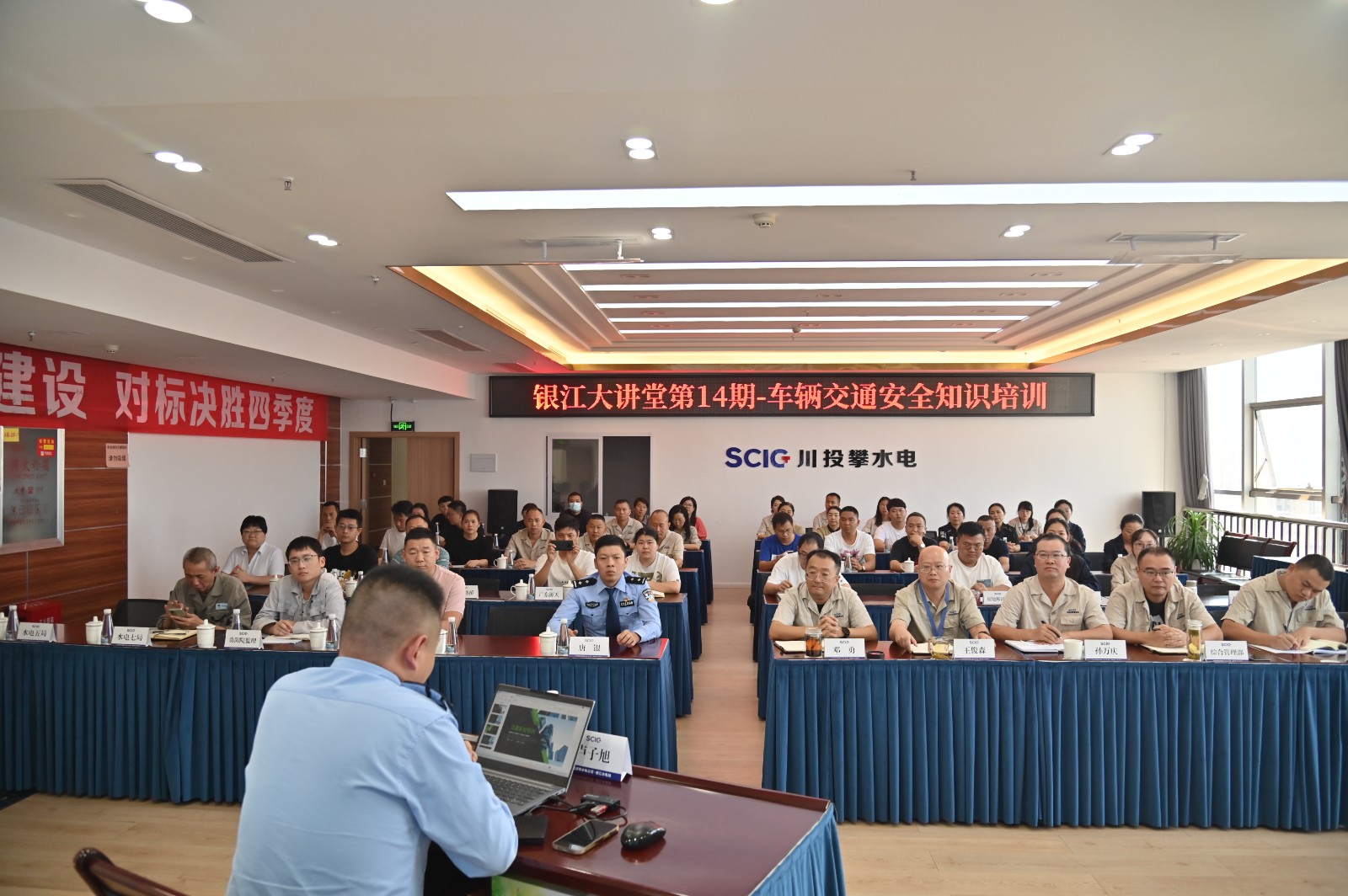 為全麵做好銀江水電站安全生產各項工作,強化各單位安全生產工作主體責任意識,切實做好車輛交通安全管理工作,10月23日,攀水電公司舉辦2023年第14期“銀江大講堂”——車輛交通安全專題培訓,邀請攀枝花市交警支隊三大隊事故民警唐銀、宣傳民警盧子旭主講,公司在攀領導、各部門員工、各參建單位有關管理人員及駕駛員共計50餘人參加。