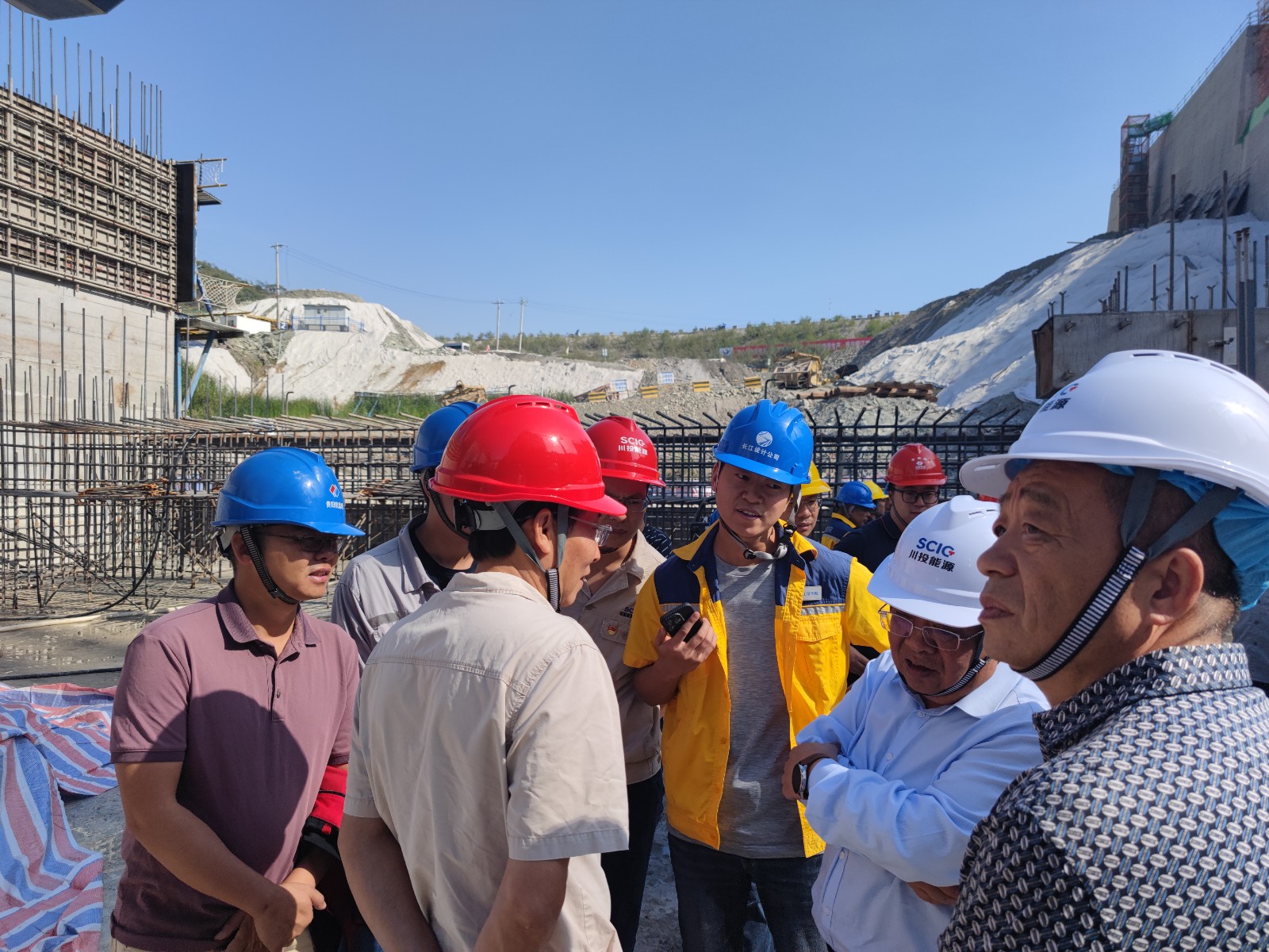 本次質量監督為隨機抽查質量監督,專家組於10月27日抵達現場後,立即安排質量監督工作。10月28日上午召開了見麵會,聽取了工程建設進展情況彙報,隨後在川投能源副總經理、公司黨總支書記、董事長徐孝剛,公司黨總支副書記、總經理吳巍嶼及各參建單位主要負責人陪同下,專家組一行到施工現場進行檢查,先後對消力池、廠房壩段、溢流壩段、安裝場、銀江大橋等施工部位以及水電五局鋼筋加工廠、廣東源天機電倉庫、砂混加工係統和現場試驗室進行了詳細檢查,並單獨抽出半天時間對龍洞灰岩料場進行現場踏勘,檢查了料源單位開采及生產情況。