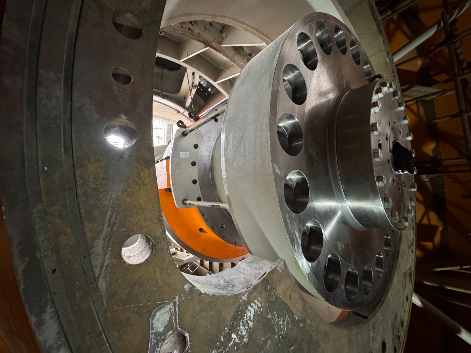 銀江水電站燈泡貫流式機組主軸為整鍛永久把合結構,總長9.6米,端部最大直徑2.83米,總重量142.66噸(dun),順(shun)水(shui)流(liu)方(fang)向(xiang)安(an)裝(zhuang),是(shi)連(lian)接(jie)發(fa)電(dian)機(ji)轉(zhuan)子(zi)和(he)水(shui)輪(lun)機(ji)轉(zhuan)輪(lun),傳(chuan)遞(di)各(ge)種(zhong)工(gong)況(kuang)條(tiao)件(jian)下(xia)扭(niu)矩(ju)的(de)核(he)心(xin)轉(zhuan)動(dong)部(bu)件(jian)。主(zhu)軸(zhou)安(an)裝(zhuang)精(jing)度(du)高(gao),中(zhong)心(xin)位(wei)置(zhi)需(xu)控(kong)製(zhi)在(zai)0.5毫米以內,端部跳動需控製在0.03毫米以內。