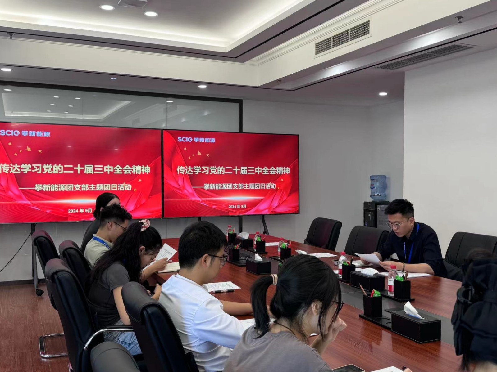 近日,攀新能源公司團支部在川投大廈707會議室舉行2024年9月主題團日活動,專題傳達學習《中國共產黨第二十屆中央委員會第三次全體會議公報》,學習貫徹黨的二十屆三中全會精神。攀新能源團支部書記、經營管理部經理潘鑫主持並領學,公司全體團員及屏山抽蓄公司全體團員參會。