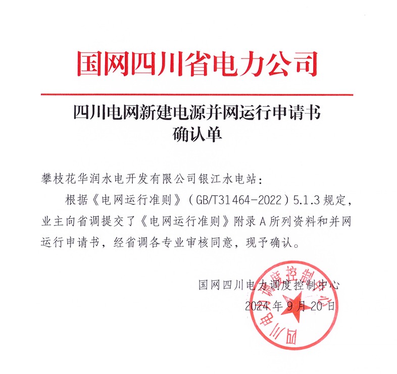 9月20日,在國網四川省電力公司和川投能源的指導幫助下,經過積極對接、多方協調,攀水電公司成功取得銀江水電站新建電源並網運行申請書確認單,標誌著銀江水電站具備並網手續辦理的資格條件。