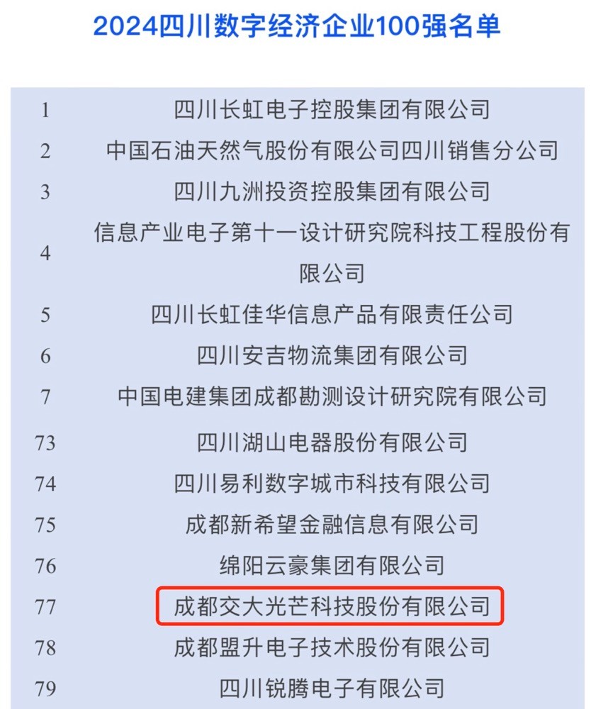 9月26日,四川大企業大集團發展大會在成都召開,會上,四川省企業聯合會發布了2024年四川企業100強、製造業100強、服務業100強和數字經濟100強榜單,交大光芒榮登四川數字經濟企業100強榜單,位列第77位。