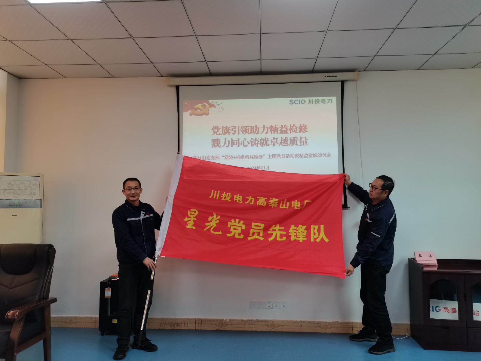圍繞機組定期檢修及技術改造等重點工作任務,高奉山黨支部精心策劃,構建“1+2+3+4”專項活動。即圍繞檢修工作召開1次主題黨日活動;設置2個黨員創精品檢修項目——“發電機定子線圈、鐵芯測溫電阻技改”“發電機出口銅排技改”;成立3個攻堅引領團隊——星光黨員先鋒隊、星光黨員攻堅隊、星光青年服務隊;建立4個檢修質量責任區——發電機區、水輪機區、電氣區、轉輪區。王橋分別為3支攻堅引領團隊授旗,4位檢修質量責任區責任人承諾,認真履行“責任在我肩上、質量在我手中”的莊嚴承諾。