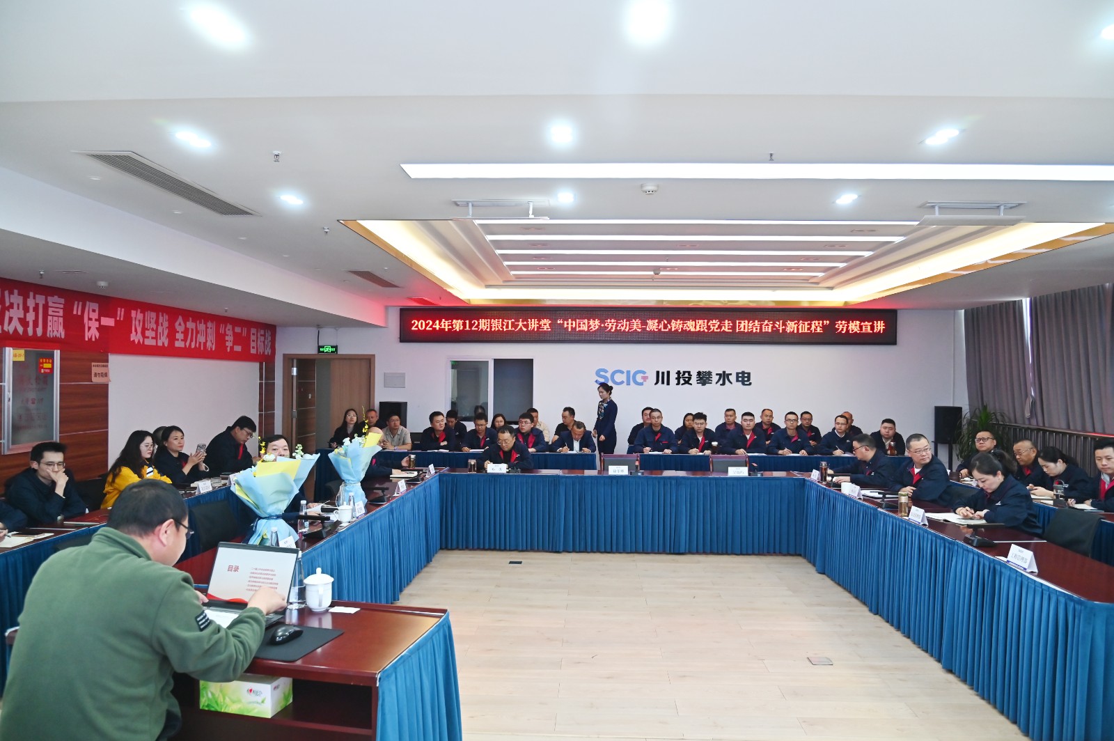 為大力弘揚勞模精神、工匠精神和“三線精神”,充分發揮勞模、工匠、先進典型的示範引領作用,形成學習先進、對標先進、爭當先進的濃厚氛圍,按照攀枝花市東區總工會相關要求,11月23日,攀水電公司工會組織開展了2024年“中國夢•勞動美——凝心鑄魂跟黨走 團結奮鬥新征程”勞模先進事跡宣講,攀水電公司幹部職工、參建單位代表共計40餘人參加會議。