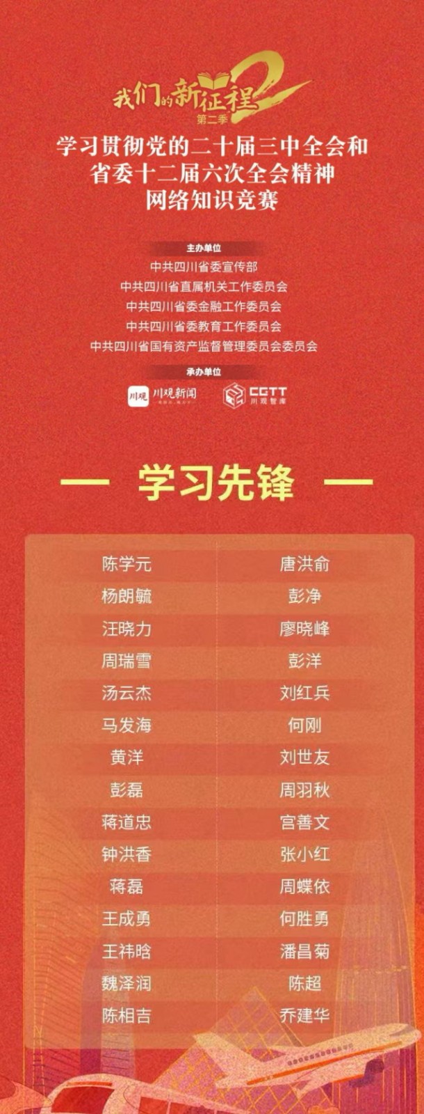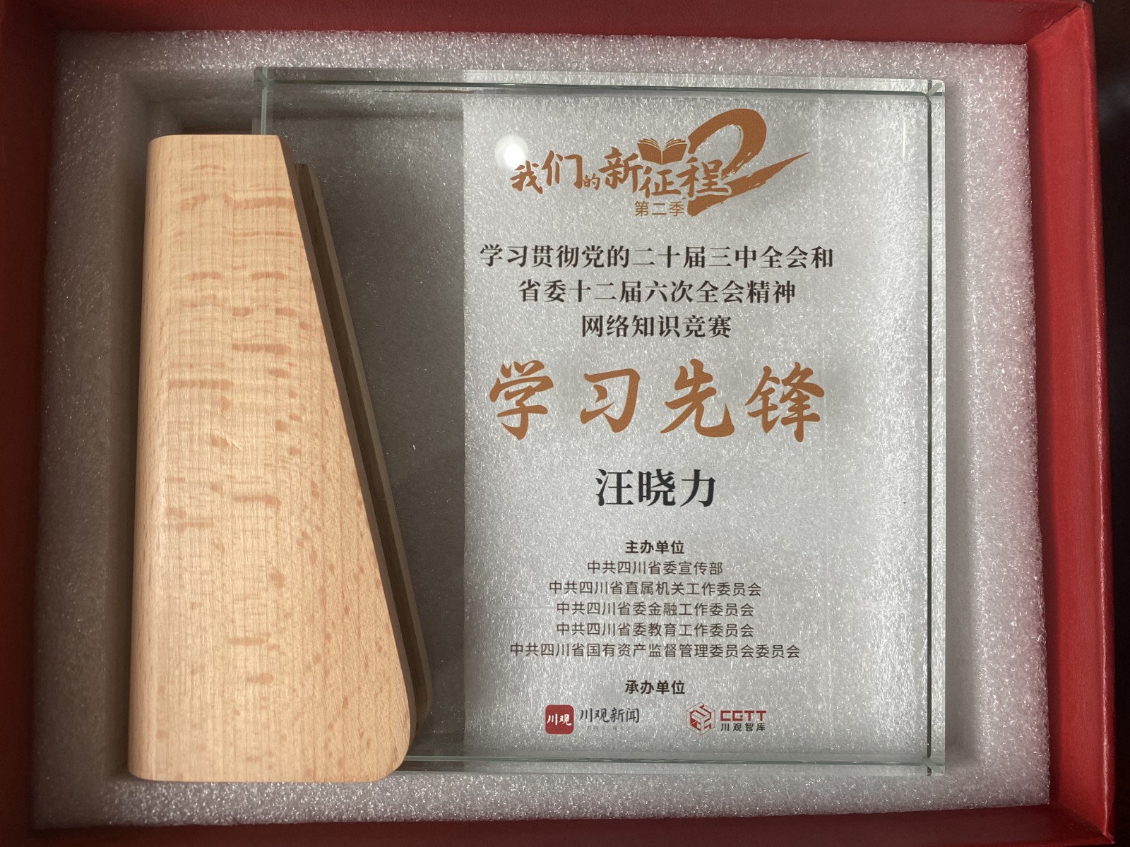 近日,由中共四川省委宣傳部、省委省直機關工委、省委金融工委、省委教育工委、省國資委黨委聯合主辦,四川日報報業集團承辦的“我們的新征程”(第二季)網絡知識競賽公布了獲獎名單,並為獲獎人員發放獎牌,川投電力所屬天彭電力11名員工憑借紮實的理論功底和鍥而不舍的努力,從全省32萬餘名參與競賽的黨員群眾中脫穎而出,進入全省個人排行榜前30名,榮獲“學習先鋒”稱號。