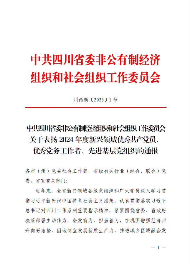 近日,中共四川省委非公有製經濟組織和社會組織工作委員會印發《關於表揚2024年度新興領域優秀共產黨員、優秀黨務工作者、先進基層黨組織的通報》,川投能源黨委交大光芒黨總支獲評“四川省2024年度新興領域先進基層黨組織”稱號。