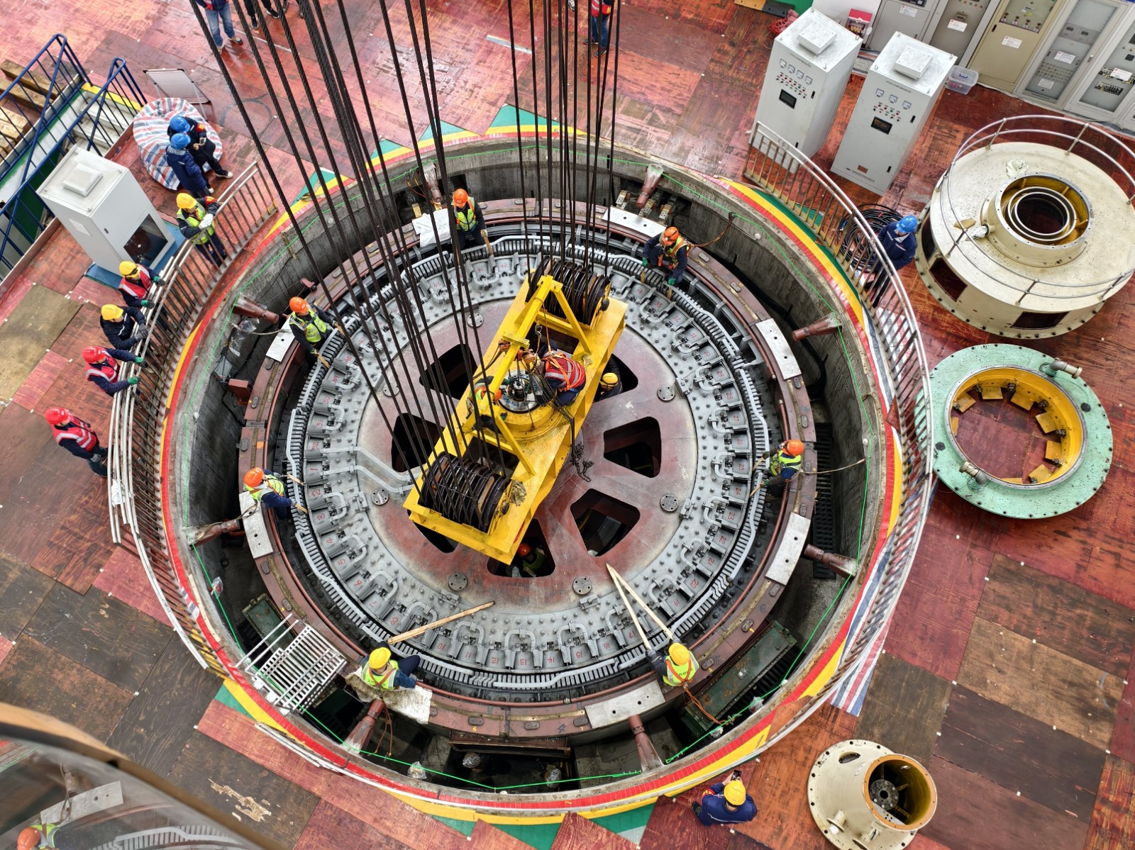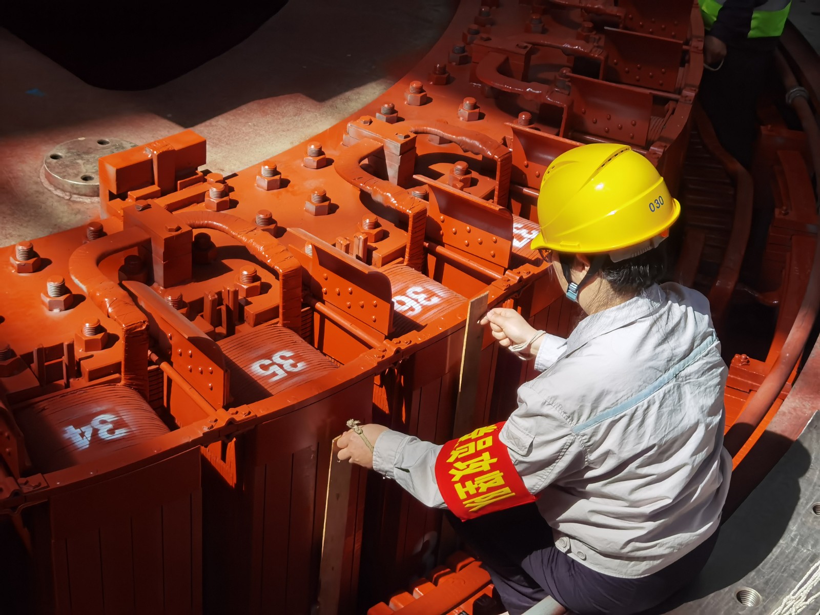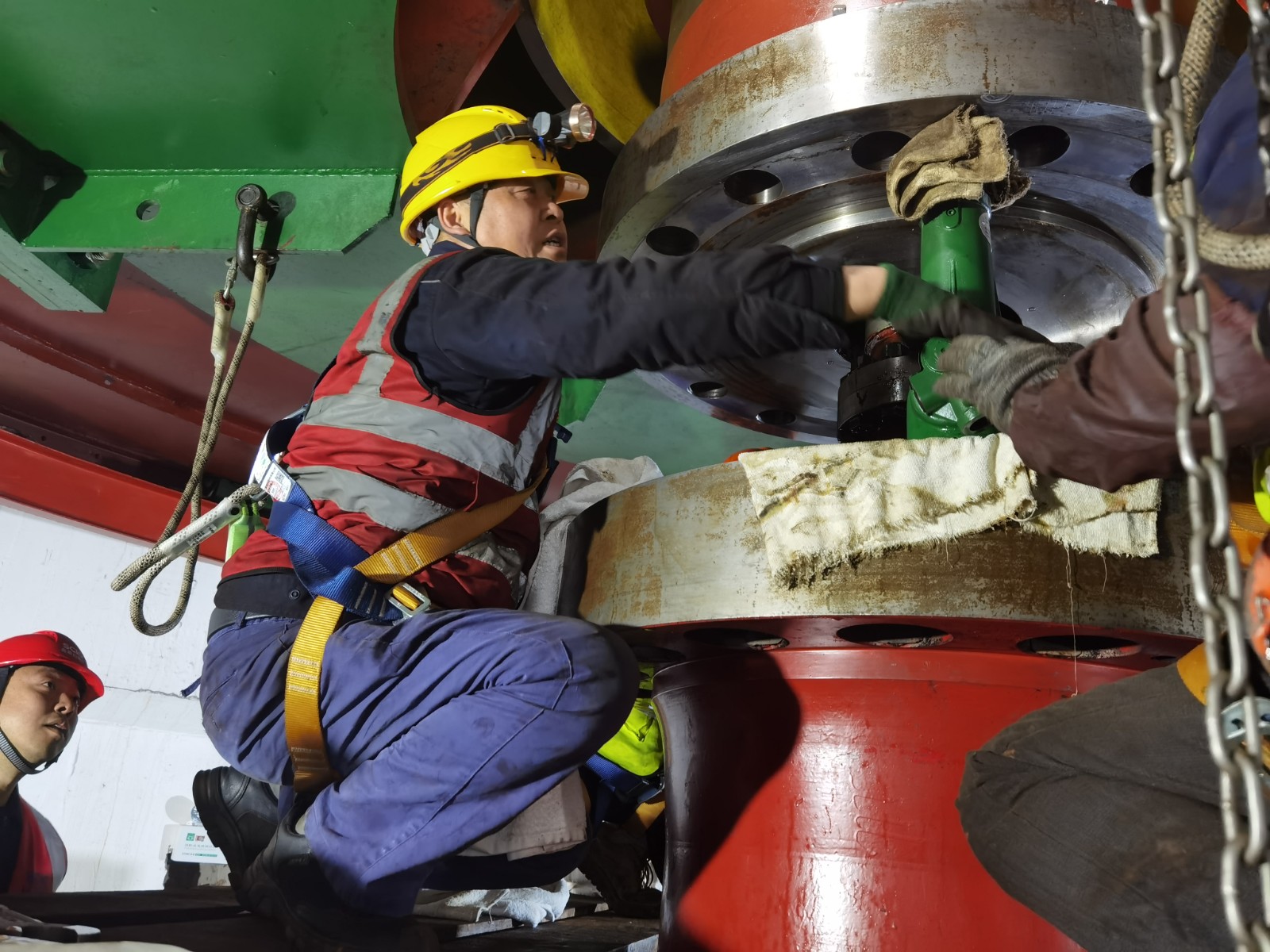 “這‘硬骨頭’我來啃,請組織放心,堅決完成任務”。4月16日,轉子回裝過程中,老黨員宋加行發揚新時代工匠精神,主動承擔高風險、高技術含量的司索崗位,他哨音清晰、手勢果斷,與起重司機配合如“榫卯銜接”。檢修團隊成員分工明確、協同配合,確保轉子回裝工作按期順利完成。