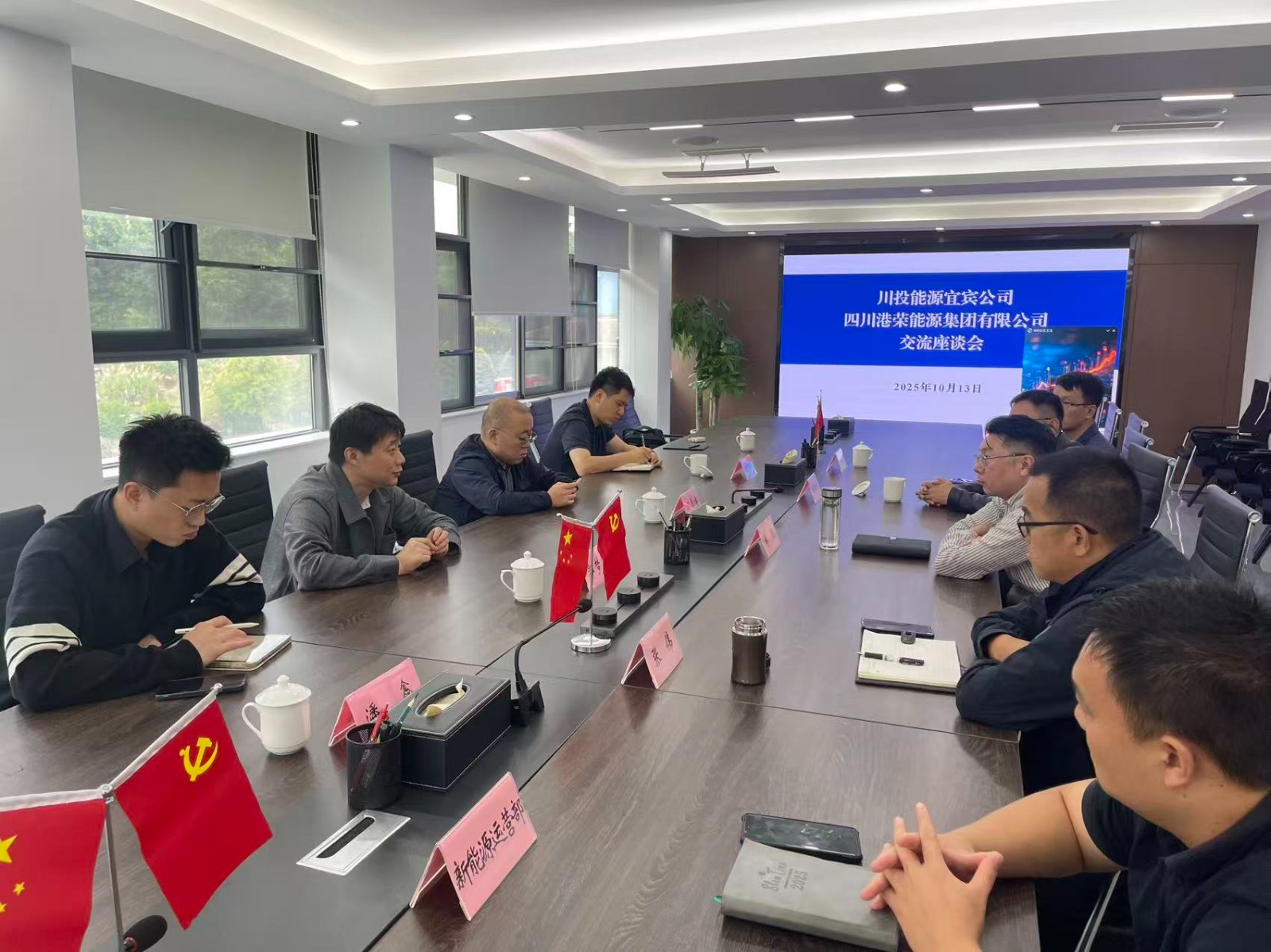 10月13日,攀新能源公司黨支部副書記、副總經理、工會主席,川投能源(宜賓)有限公司董事長郭夢夏一行赴四川港榮能源集團有限公司調研,雙方開展交流座談。港榮能源公司黨總支副書記、總經理李貌出席並主持座談會議。