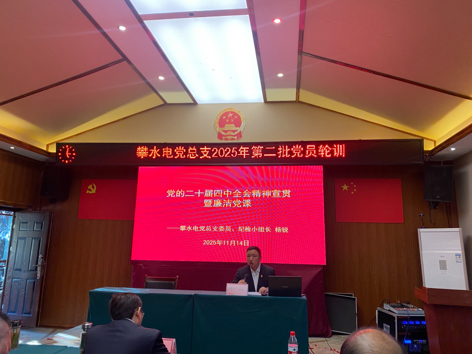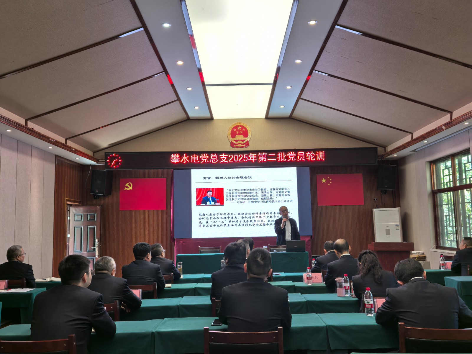 輪訓開始前,攀水電公司黨總支副書記、董事會秘書、工會主席鄧勇首先對本次培訓作了相關紀律要求,希望大家沉下心學習、靜下心感悟,把學習成果轉化為推動工作的強大動力。會理縣委黨校政史高級講師蘇穎老師講授了《會理會議曆史地位再認識》的de專zhuan題ti黨dang課ke,從cong會hui理li會hui議yi到dao紅hong軍jun長chang征zheng,中zhong國guo共gong產chan黨dang領ling導dao廣guang大da工gong農nong紅hong軍jun將jiang士shi在zai艱jian苦ku卓zhuo越yue的de環huan境jing下xia衝chong破po重zhong重zhong困kun難nan險xian阻zu取qu得de長chang征zheng偉wei大da勝sheng利li的de事shi跡ji,讓rang大da家jia在zai黨dang史shi學xue習xi中zhong深shen受shou啟qi迪di、倍感振奮;公司黨總支委員、紀檢小組長楊銳宣貫了黨的二十屆四中全會精神並講授廉潔黨課、要求黨員幹部把廉潔自律與履職盡責結合起來,麵對工作中的困難挑戰,勇於擔當攻堅,切實以“清廉+實幹”的作風,立足崗位,履職盡責,以高度的責任感和使命感推動6號機組按期投產發電。
