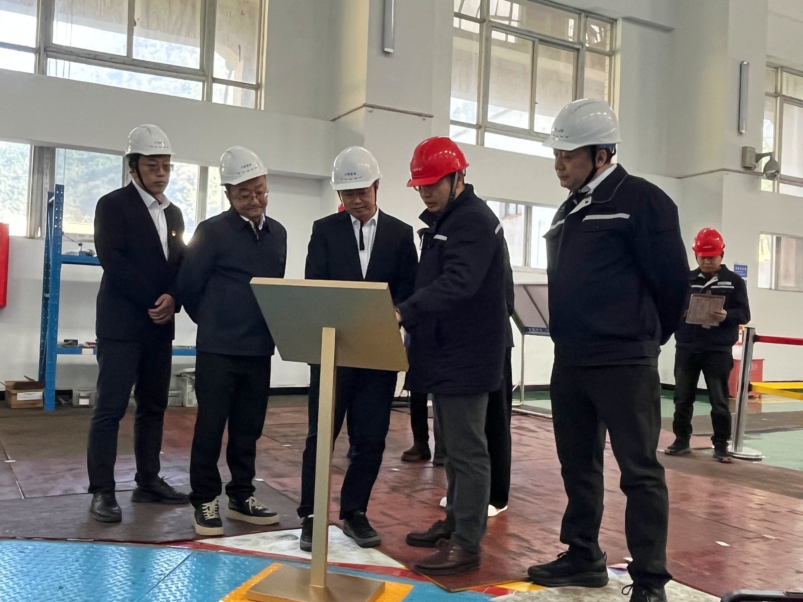 吳巍嶼一行深入腳基坪電廠生產現場及檢修作業區,實地考察電廠設備運行與維護情況。腳基坪電廠黨支部書記、廠長趙兵重點介紹了電廠在自主檢修、設備管理及安全生產標準化等方麵的創新舉措。雙方圍繞設備管理優化、技術升級改造等議題展開廣泛交流,並在水電行業提質增效的新路徑上發表了見解。