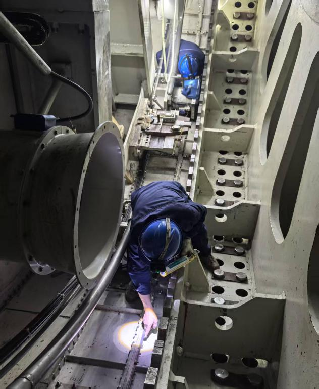 本次1號機組C級檢修緊扣“安全運維、降本增效”的核心目標,采取“專業協同、模塊推進”的方式有序推進。機械專業團隊圍繞設備性能提升,重點開展流道全麵檢查、導葉間隙檢查與調整,同步完成各類管路清掃、油箱內部清掃,實施1號液壓鎖定接力器銅墊安裝、調試及間隙處理等;電氣專業團隊聚焦電氣係統功能的恢複,開展發電機定子、轉子絕緣檢測與清潔保養,完成斷路器預防性試驗、繼電保護裝置校驗及控製係統邏輯測試,同步檢查輔助係統。