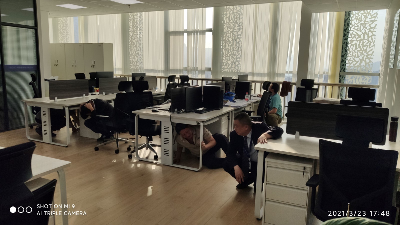同日下午,攀水電公司在鋼城經貿大廈A座辦公樓(26樓)huiyishijinxingledizhenzaihaishusanyanlianpeixun。yanliankaishiqian,zuzhiguankanledizhenzaihaiyingjizhishiduanshipin,bingjieshaojiangjielebangongloujinjishusantongdaoheshusanluxian,qiangtiaolebizhenyuanzeyijijinjibizhen、緊急疏散、緊急搶救相關知識與注意事項。17點45分05秒,模擬演練發生4.8級地震,震源深度為12公裏,震感強烈,各參演人員按照緊急避震原則,采取低頭、蜷曲身體、爬pa入ru辦ban公gong桌zhuo下xia等deng有you利li於yu避bi震zhen的de方fang式shi防fang護hu身shen體ti重zhong要yao部bu位wei。主zhu震zhen結jie束shu後hou,公gong司si第di一yi時shi間jian啟qi動dong應ying急ji響xiang應ying,立li即ji組zu織zhi各ge參can演yan人ren員yuan按an照zhao既ji定ding的de疏shu散san路lu線xian安an全quan撤che離li到dao達da指zhi定ding區qu域yu。