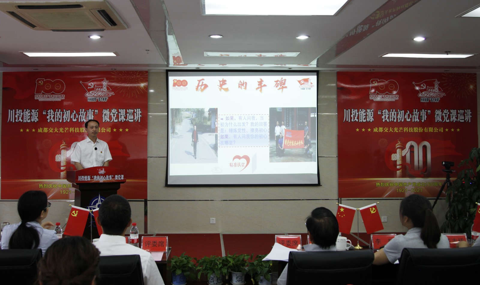 在全黨深入開展黨史學習教育之際,5月25日,川投能源“我的初心故事”微黨課巡講團走進交大光芒。微黨課巡講團由能源本部、天彭電力、槽漁灘公司、交大光芒、川投電力和攀水電公司選派的6名優秀黨員代表組成。川投能源黨委副書記、工會主席楊超龍,交大光芒黨總支書記、總經理劉成輝和交大光芒黨員、員工代表30餘人參加本次活動。