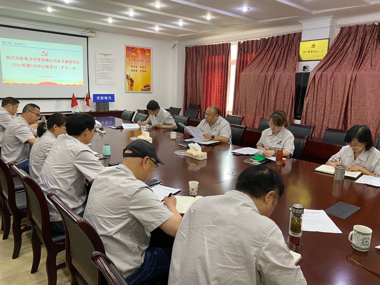6月1日上午,川投能源天彭電力黨總支在公司二樓會議室召開2021年第5次中心組學習(擴大)會,公司領導、黨員幹部、關鍵崗位人員參加會議,會議由黨總支書記、總經理陳忠主持。