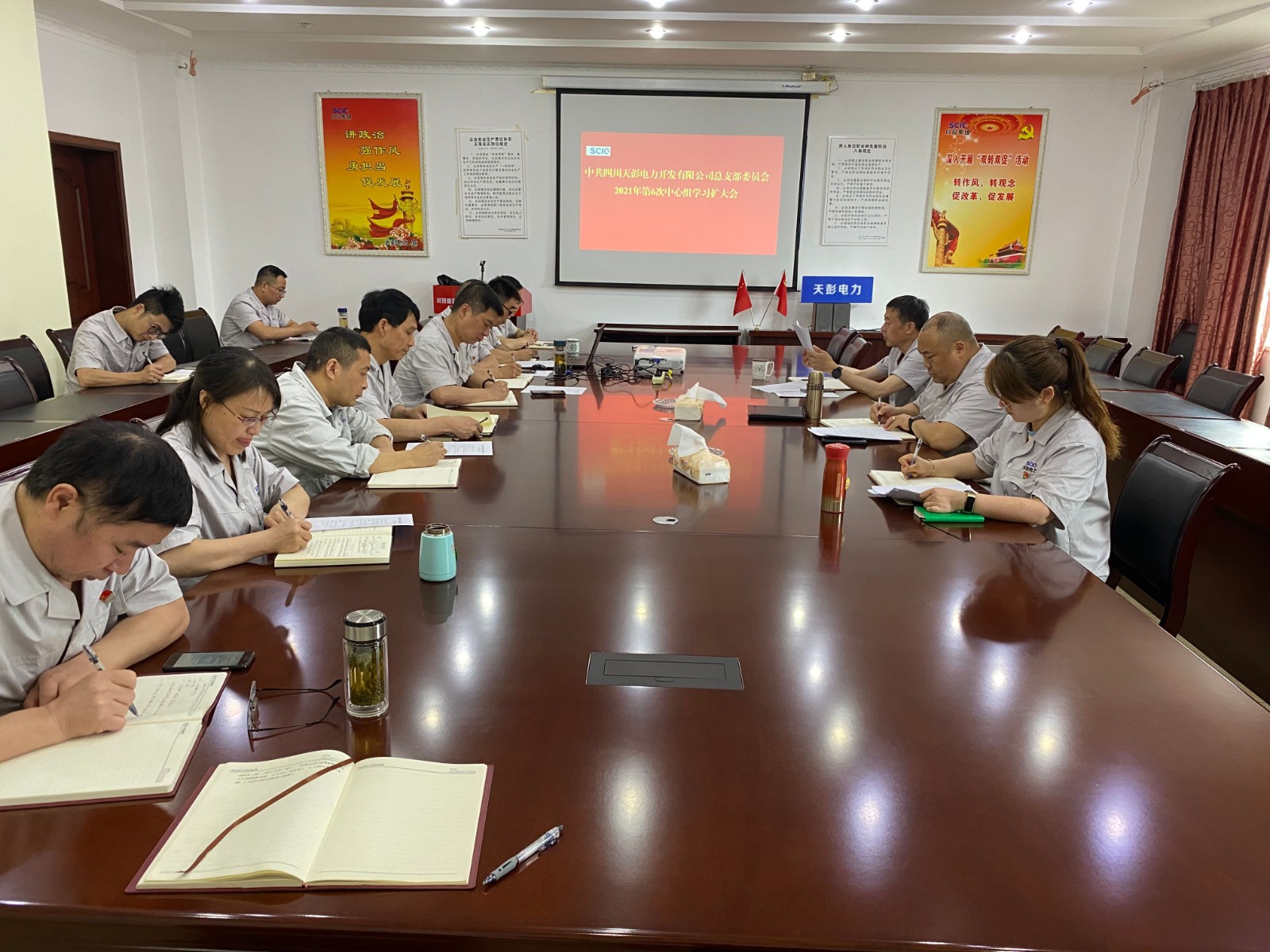 6月8日上午,川投能源天彭電力黨總支在公司二樓會議室召開2021年第6次中心組學習(擴大)會,公司領導、黨員幹部和關鍵崗位人員參加會議,會議由黨總支書記、總經理陳忠主持。