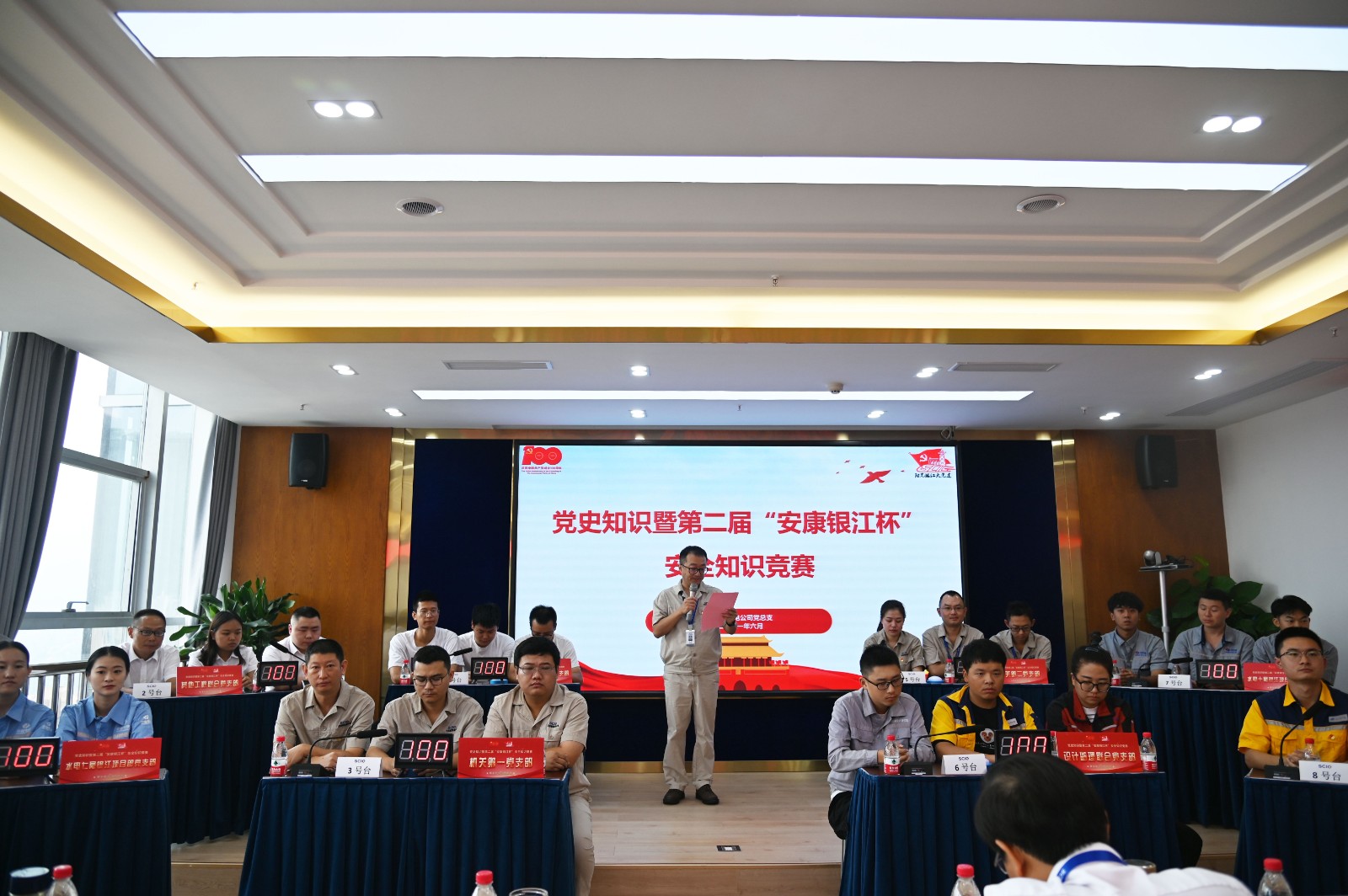 6月30日上午,在中國共產黨成立100周年華誕前夕,也是第20個安全生產月活動圓滿收官的日子裏,攀水電公司黨總支在公司2620會議室開展黨史知識暨第二屆“安康銀江杯”安全知識競賽活動,來自“陽光銀江大黨建”六個聯建支部和兩個機關支部全部組隊參賽,公司及各參建單位領導、全體黨員職工、聯建支部代表共60餘人參加活動。