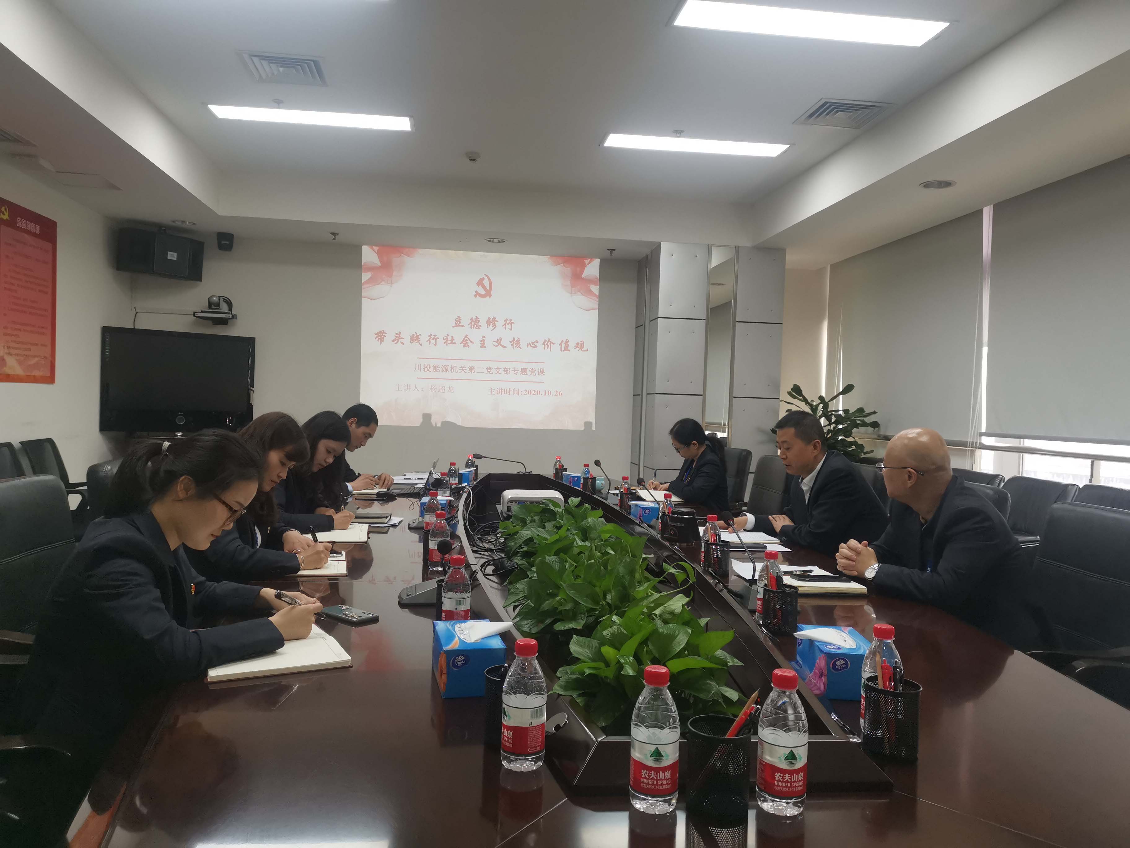 10月26日,川投能源機關第二黨支部召開黨員大會,公司黨委副書記、工會主席楊超龍以《立德修行,帶頭踐行社會主義核心價值觀》為題,就社會主義核心價值觀的內容、重要意義以及黨員幹部如何踐行三個方麵,結合理論與自身感悟,深入淺出地為二支部黨員講授了一堂精彩的黨課。