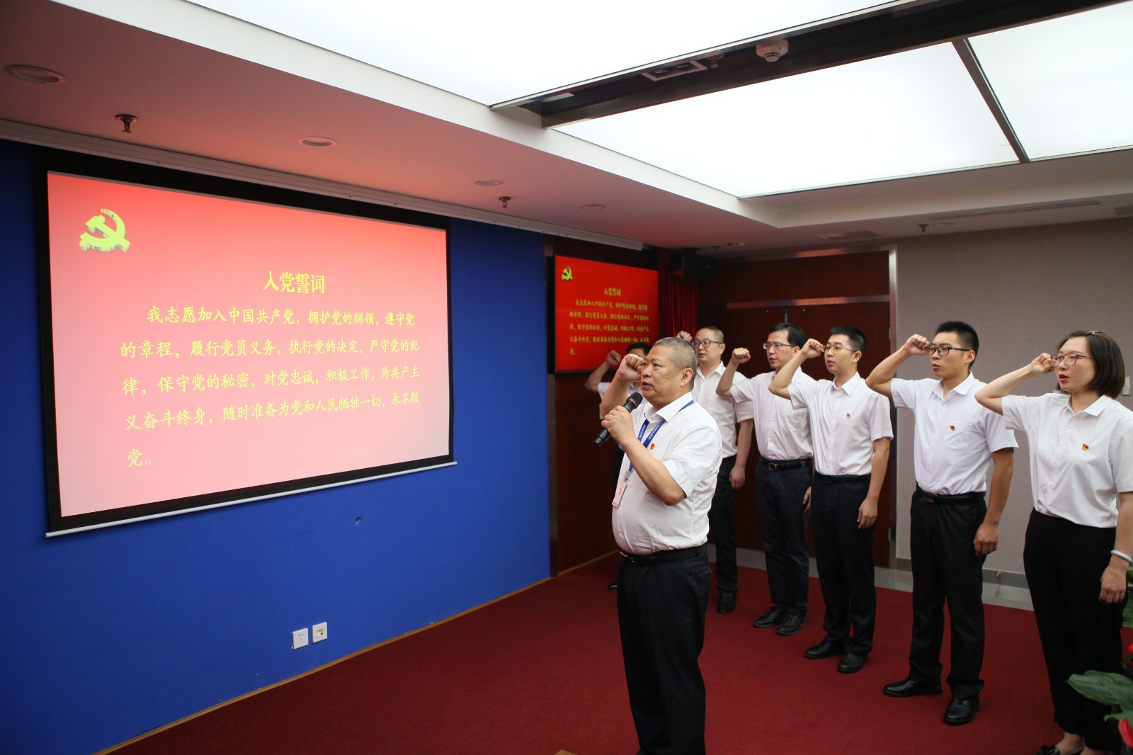 一段誓詞許下莊嚴承諾。大會在激昂高亢的國歌聲中拉開帷幕。隨後,公司黨委書記、副董事長、總經理楊洪帶領新老黨員,鄭重地舉起右手,麵對黨旗莊嚴宣誓,在主會場內、在彭州龍門山下、在洪雅青衣江畔、在銀江攀西高原之上,響徹起共產黨人的錚錚誓言。